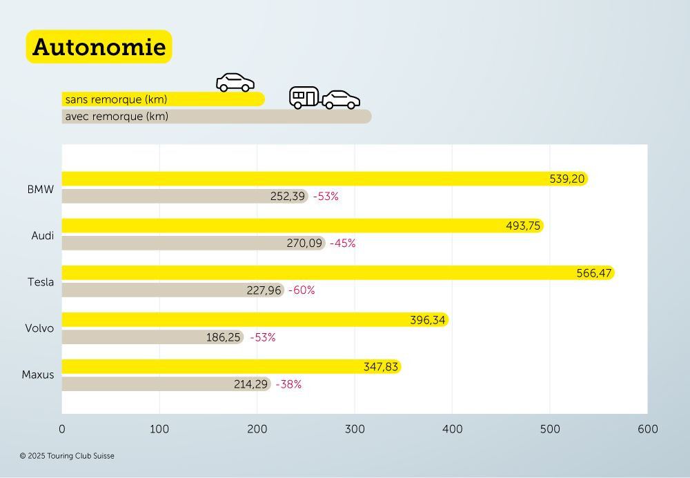 L'étude du Touring Club Suisse (TCS) s'est concentrée sur la capacité de remorquage des voitures électriques et sur les effets du remorquage sur l'autonomie. Cinq voitures électriques des constructeurs BMW, Audi, Tesla, Volvo et Maxus ont été testées, avec des capacités de traction comprises entre 1 600 et 3 500 kilos.