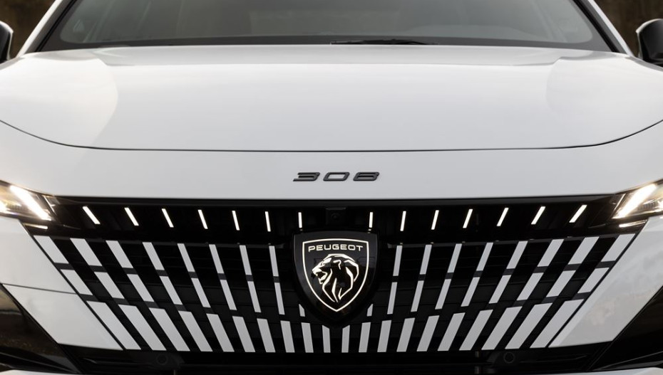 La 308 bénéficie d'une face avant renouvelée illuminée. Le blason Peugeot lumineux est au cœur de la face avant renouvelée. Au-dessus du blason, un ensemble de brins lumineux surligne la calandre et prolonge l'illumination vers les projecteurs. Le radar de proximité, dissimulé derrière le blason, reste invisible.